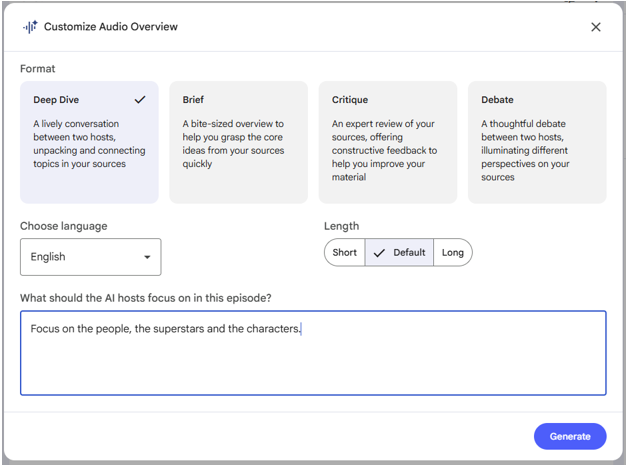 I highly recommend the Audio Overview, and that you open it with the interactive mode. Once there, ask some questions interactively. The hosts will then pause the podcast to respond to your question.