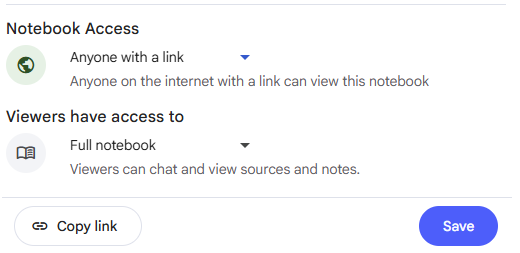 If you want to share your notebook, you can share with other individuals as (view / editor), or with anyone who has access to the link.